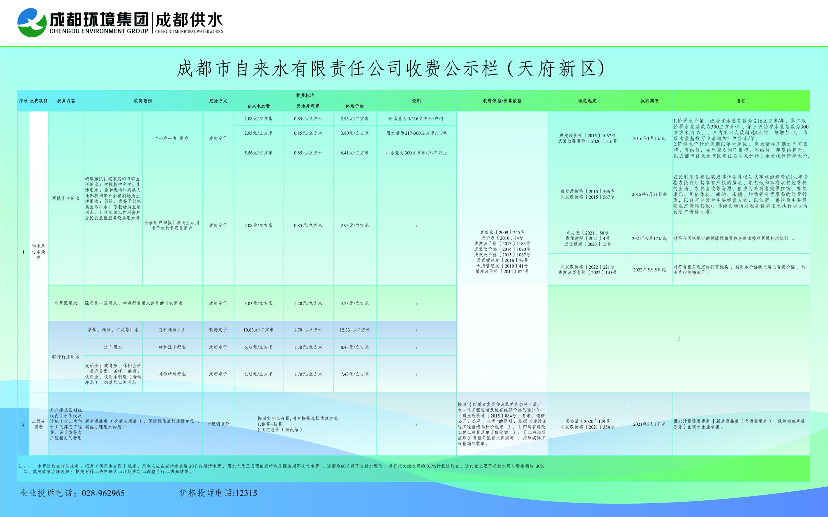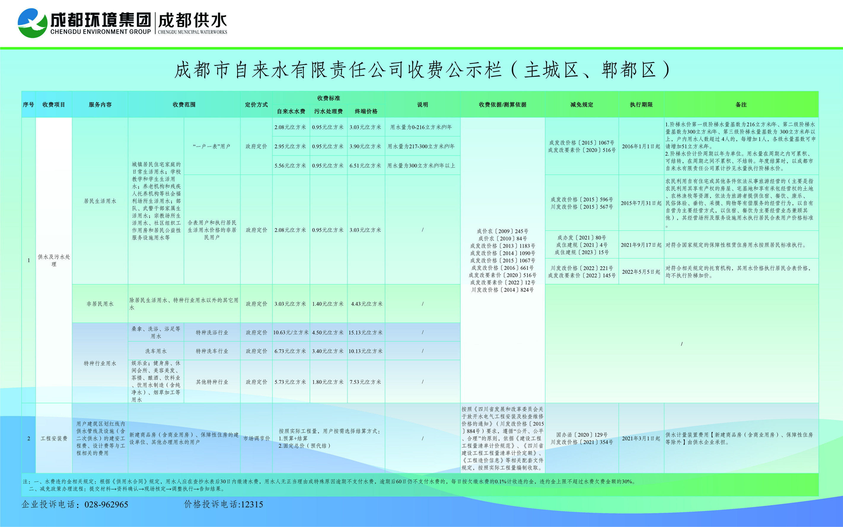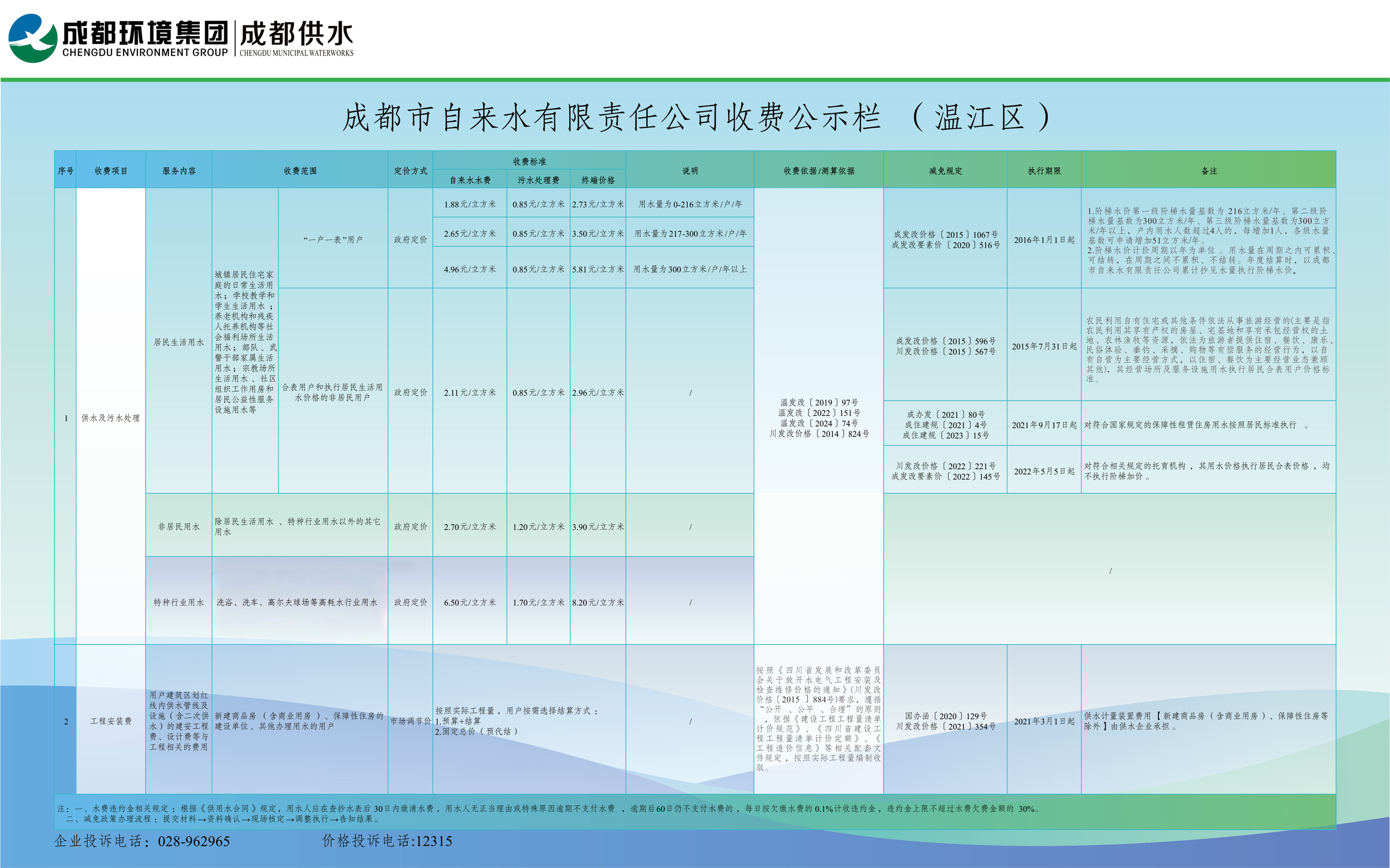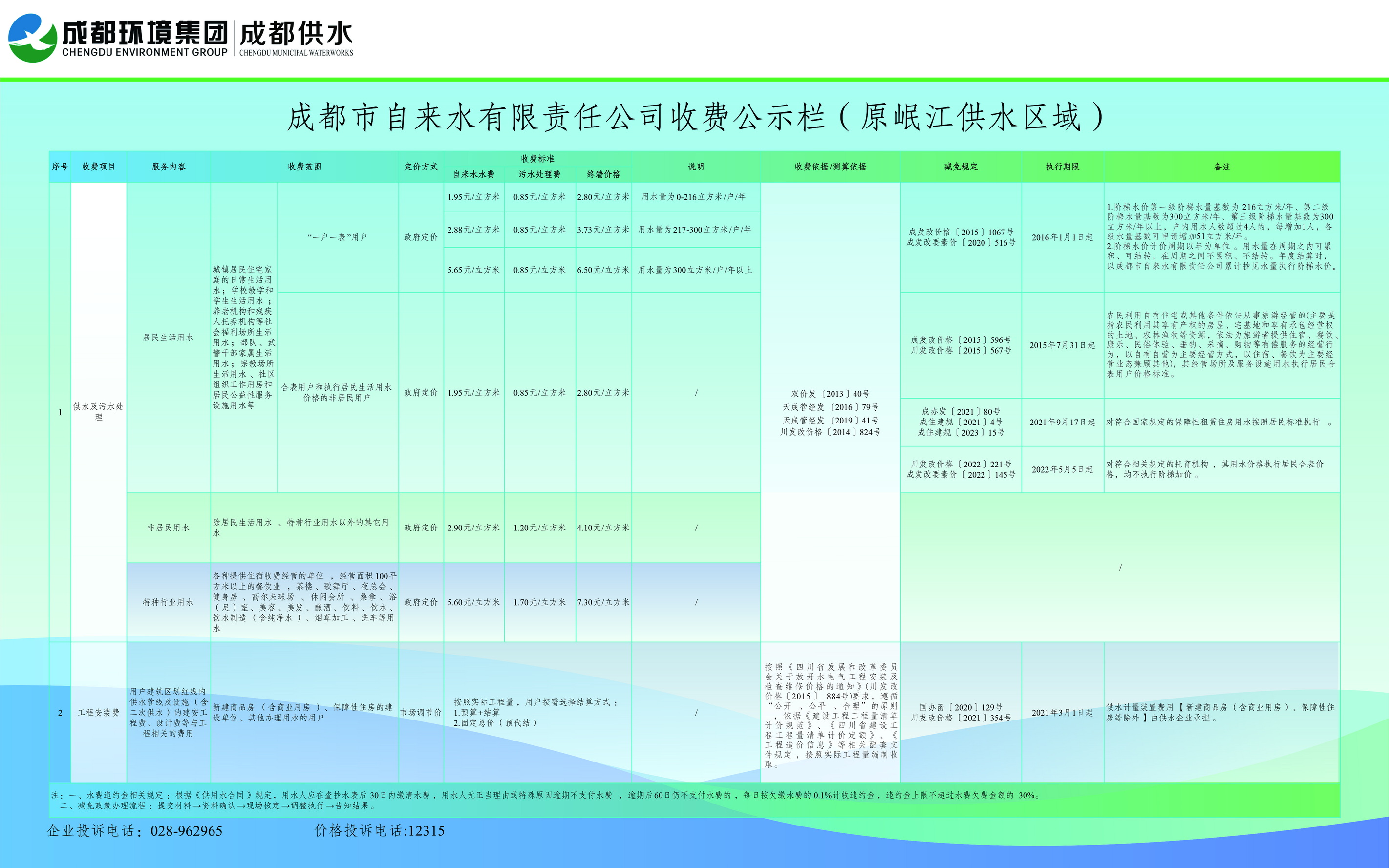 成都市自来水有限责任公司供水及污水处理收费标准